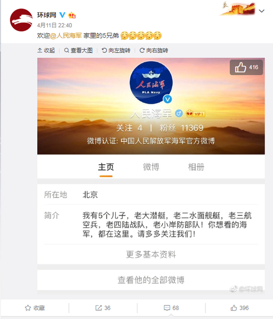 “人民海军”官微上线 简介称"我有5个儿子,老大潜艇,老二水面舰艇,老三航空兵,老四陆战队,老小岸防部队!你想看的海军,都在这里。请多多关注我们!"