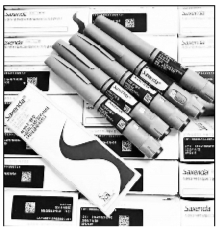 目前,在网络上到处可以看到这种网红减肥笔,其外形酷似一支圆珠笔,蓝色笔身上贴着白色标签,标签上印有Saxenda字样。打开一端的“笔盖”,就可以看到一次性针头。