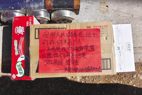 4月5日,拉萨市消防救援支队城关区消防大队收到了一份礼物,有市民将一箱苹果、四箱牛奶和饮料悄悄放在了城关区消防大队门口,然后迅速离去。这些礼物上面贴着一张纸,上面写着“愿你们负重前行,平安归来。”