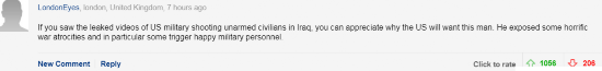 “如果你看到美国军方在伊拉克射杀手无寸铁的平民的视频,你就能理解为什么美国会想要这个人。他揭露了一些可怕的战争暴行,特别是一些好战的军事人员。”