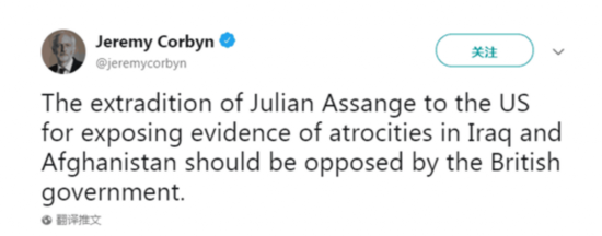 此外,英国反对党工党领袖杰里米·科尔宾公开反对向美国引渡阿桑奇,他在推特上称,“因为揭露了(美国)在伊拉克和阿富汗犯下暴行的证据,阿桑奇将被引渡到美国。英国政府应该反对引渡。”