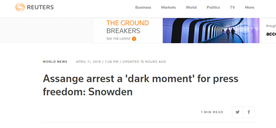 英国路透社尽管没有公开表明立场,但报道了斯诺登对于阿桑奇被逮捕的看法:“这是新闻自由的黑暗时刻”。