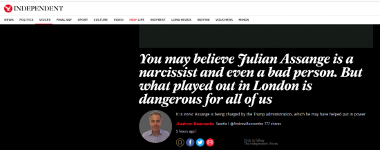 此外,英国《独立报》则引用评论员文章:“你或许以为阿桑奇并不是好人,但事实上在伦敦正上演的一切对英国是非常危险的。”