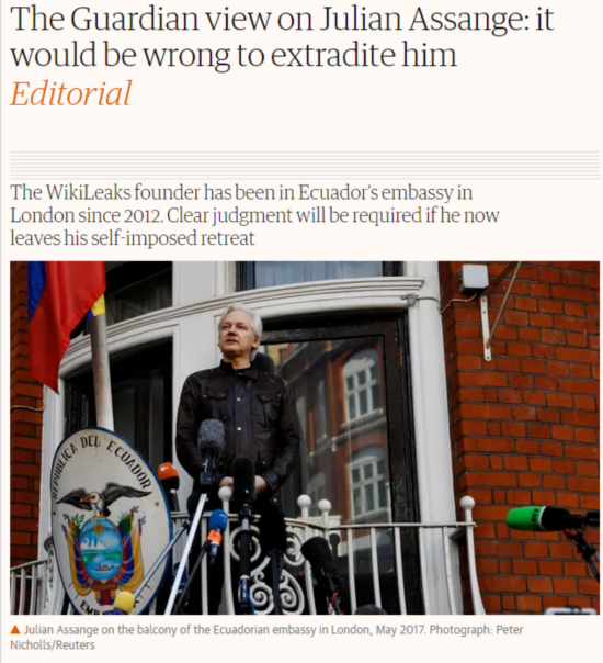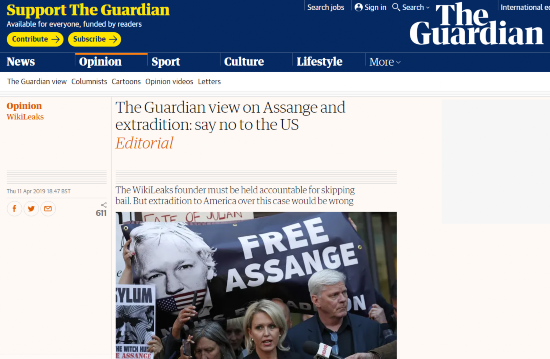 《卫报》以社评的方式表示反对,认为对阿桑奇的引渡是错误的。社评文章称,将阿桑齐引渡美国既不安全,也不正确,认为这将加剧美国对于阿桑齐这样不同政见者的对抗立场。