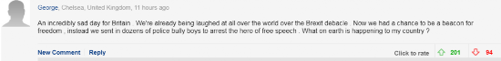 “这对英国来说是令人难以置信的悲哀的一天。我们已经因为英国脱欧的失败而被全世界嘲笑。现在我们有机会成为自由的灯塔,却派了几十个警察去逮捕言论自由的英雄。我的国家到底发生了什么?”
