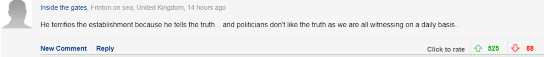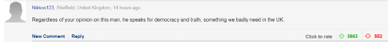 “不管你对这个人的看法如何,他是为民主和真理而辩护,而这是我们在英国迫切需要的。”