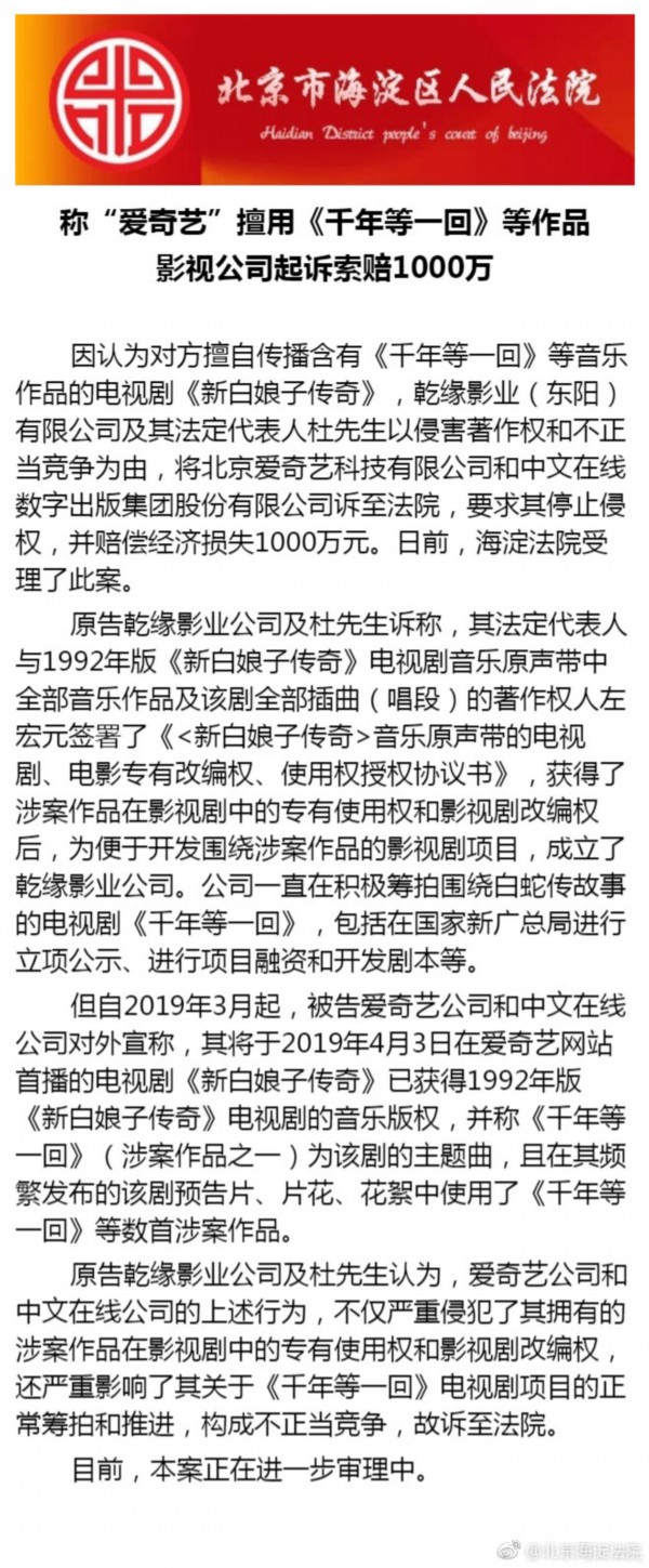 北京海淀法院官方微博4月12日消息,因认为对方擅自传播含有《千年等一回》等音乐作品的电视剧《新白娘子传奇》,乾缘影业(东阳)有限公司及其法定代表人杜先生以侵害著作权和不正当竞争为由,将北京爱奇艺科技有限公司和中文在线数字出版集团股份有限公司诉至法院,要求其停止侵权,并赔偿经济损失1000万元。日前,海淀法院受理了此案。