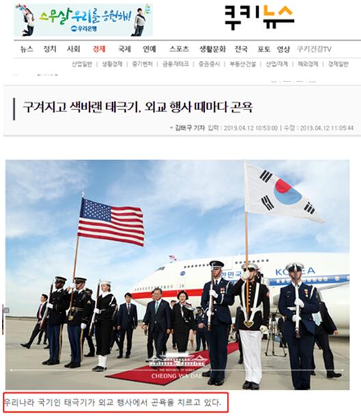 果然,韩国媒体“kukinews”就发表了一篇题为《起皱又褪色的太极旗,每次在外交活动上受辱》报道,文章第一句就称“我们的国旗太极旗在外交活动中受辱”。