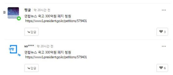 还有网友甚至在青瓦台网站请愿,要求取消政府每年拨给韩联社的300亿韩元补贴。