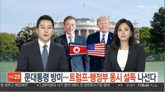 4月10日,韩国主流媒体之一韩联社旗下“韩联社TV”电视台在播报文在寅访美的新闻时,给文在寅配了朝鲜国旗,而不是韩国的太极旗。