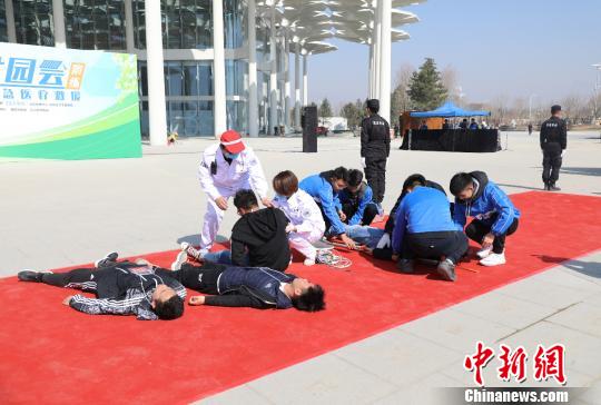 此次演练场景模拟某日上午9时30分,某偶像团体将到世园会参演,大批粉丝从全国各地涌来,导致世园会国际馆东侧人员拥挤。一些女粉丝由于劳累晕倒,继而引发多人摔倒、跌压,发生踩踏事件,导致多名人员受伤。