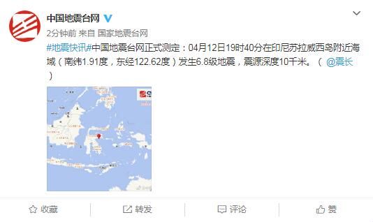 中国地震台网正式测定:04月12日19时40分在印尼苏拉威西岛附近海域(南纬1.91度,东经122.62度)发生6.8级地震,震源深度10千米。