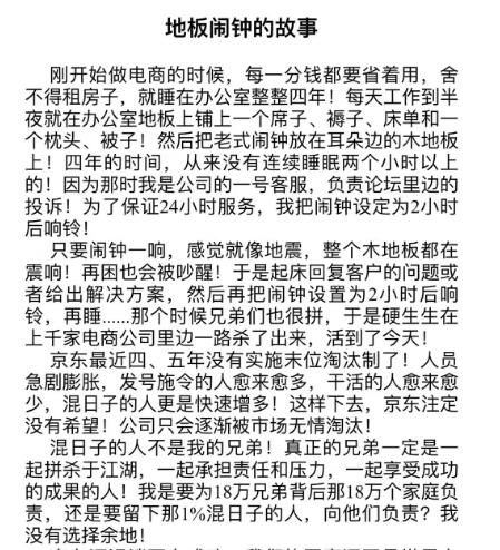 刘强东说,那时候兄弟们也很拼,硬生生在上千家电商公司里边一路杀了出来,活到了今天。在他看来,现在的经典人员膨胀,干活的人越来越少,混日子的人越来越多,如此下去京东会被市场淘汰。