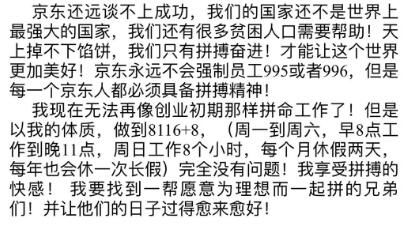 此外,对于近期大热的996话题,刘强东也给出了正面回答,“京东永远不会强制员工995或者996,但是每一个京东人都必须具备拼搏精神!”他说到,自己可以做到每周一到周六,早8点到晚11点,周日工作8小时。