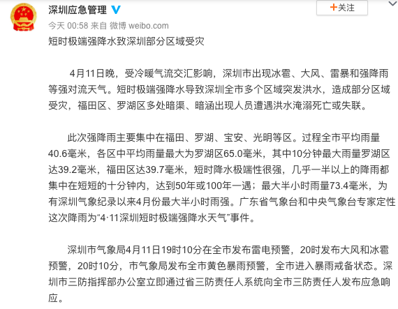 据深圳市应急管理局官方微博消息,4月11日晚,受冷暖气流交汇影响,深圳市出现冰雹、大风、雷暴和强降雨等强对流天气。短时极端强降水导致深圳全市多个区域突发洪水,造成部分区域受灾,福田区、罗湖区多处暗渠、暗涵出现人员遭遇洪水淹溺死亡或失联。