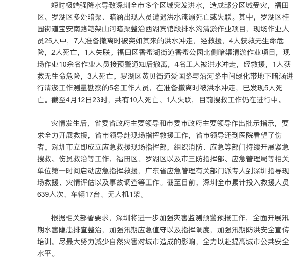 短时极端强降水导致深圳全市多个区域突发洪水,造成部分区域受灾,福田区、罗湖区多处暗渠、暗涵出现人员遭遇洪水淹溺死亡或失联。其中,罗湖区桂园街道宝安南路笔架山河暗渠整治西湖宾馆段排水沟清淤作业项目,现场作业人员25人中,7人准备撤离时被突如其来的洪水冲走,经救援,4人获救无生命危险,2人死亡,1人失联。福田区香蜜湖街道香蜜公园北侧暗渠清淤作业项目,现场作业10余名作业人员接预警通知后撤离,4名工人被洪水冲走,经救援,1人获救无生命危险,3人死亡。罗湖区黄贝街道爱国路与沿河路中间绿化带地下暗涵进行清淤工作测量勘察的5名工作人员,在准备撤离时被洪水冲走,已发现5人死亡。截至4月12日23时,共有10人死亡、1人失联,目前搜救工作仍在进行中。