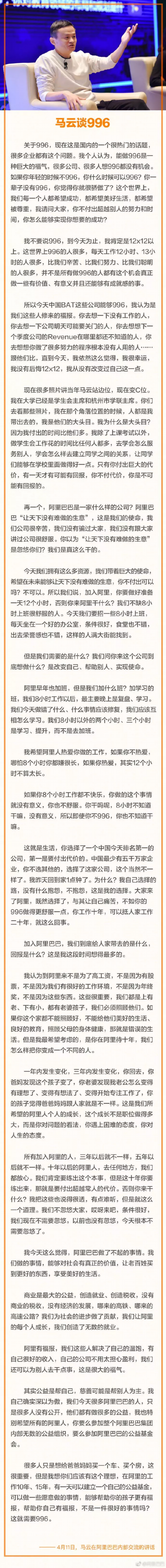 4月12日,阿里巴巴官微分享了马云在阿里内部交流活动《帕特纳有约》上对近来热门话题“996”工作制的看法。
