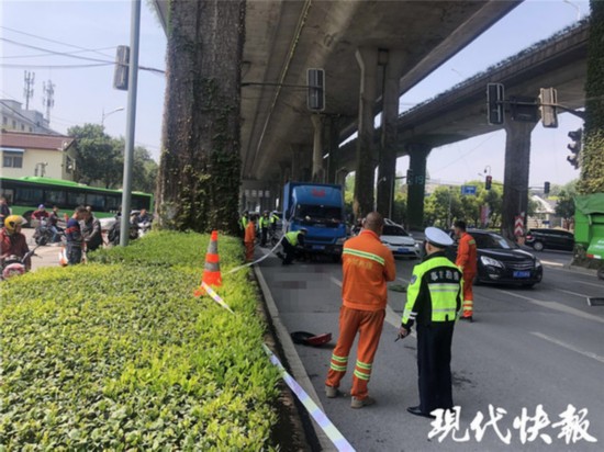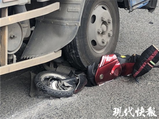 现代快报讯4月13日中午11点多,南京秦淮区应天大街与江宁路交叉口附近发生一起事故。一辆厢式货车由西向东行驶时,一名女子骑电动车冲了过来。货车避让不及,电动车被卷入车底,骑车女子被撞,不幸身亡。