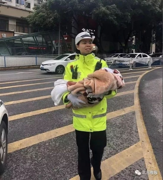 3分钟后,两人开着警车来到了飞来寺路口。90后的女民警陈应洋立即上前去接过婴儿。