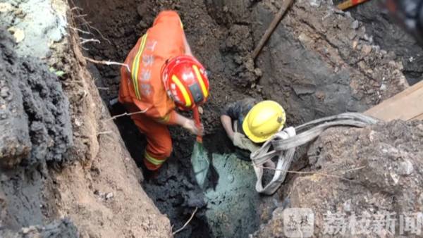 救援人员在救出上方被困工人后,立即对下方被困人员展开营救。下方人员胸部以下都被土方埋压,只有头部和右手露在外面,救援人员决定同时运用机械和人力,轮流清理土方,同时用救援腰带将工人的上半身固定住。
