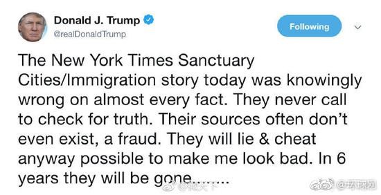“今天《纽约时报》关于庇护城市和移民的报道几乎所有事实都是错的。他们从不打电话去核对事实,他们引用的消息源往往都不存在,这是一种欺诈行为。他们为了让我看起来很惨,会尽其所能去撒谎、骗人。再过6年,他们就会倒闭。。。。。。”。