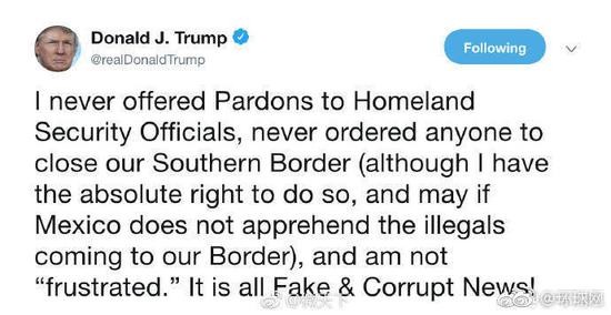 “我从未赦免过国土安全部官员,也从未命令过任何人关闭我们的南部边境(尽管我有权力这么做,如果墨西哥不把那些进入我们边境的非法移民抓起来的话,我可能就会这么做)。这些都是假新闻!烂报道!