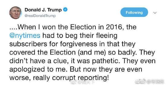 “当我赢得2016年大选时,《纽约时报》不得不乞求退订了他们报纸的订阅者的原谅,因为他们报纸对大选(和我)的报道太烂了!他们一点线索都没有,这很可悲。他们甚至还向我道歉来着。但现在他们更烂了,真是烂报道!”