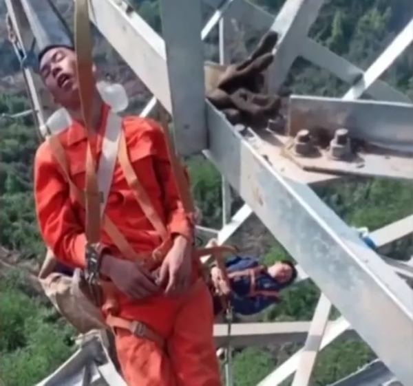一座50米高的电力塔上,几名中国电力工人疲惫地依靠在电力塔铁架上,趁着工作间隙闭眼休息。