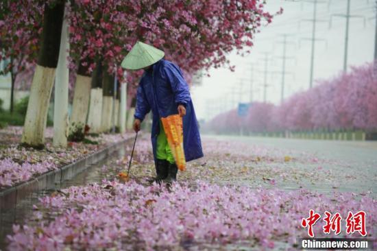 清洁工在满是紫荆花的街道上清理垃圾。