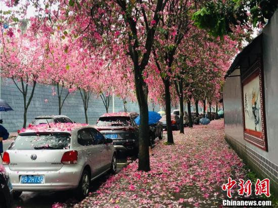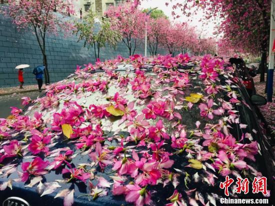 4月14日,一场大雨降临广西柳州市,27万株绽放的紫荆花伴随着雨点飘落,好似“紫荆花雨”一般。道路上铺满的紫荆花与树上的粉红相映成趣,停放在紫荆树下的车辆,被花瓣装点得犹如“花车”。图为柳州市鱼峰区葡萄山路紫荆花如雨般纷纷凋落。
