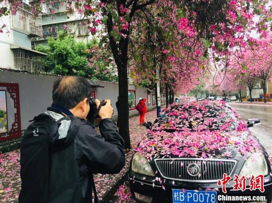 紫荆花如雨般凋落,道路变成粉红色。