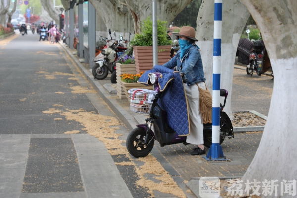 当日上午10时左右,荔枝新闻网友来到中山东路,能清晰地看到空中密集飘浮的飞絮,不慎吸入鼻子里,总想打喷嚏。车辆驶过,带起成团的飞絮借着风势四处飞舞,被卷起的毛絮落在附近行人的头上和肩上,很多人只得用手或衣服捂住鼻子,快步走过。