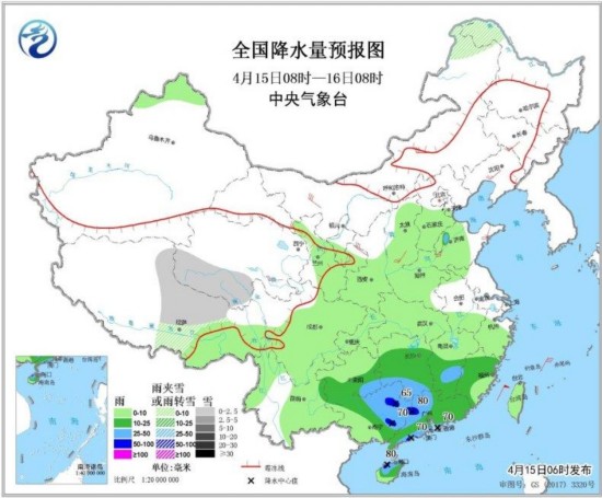 4月15日08时至16日08时,西藏中北部、青海南部等地的部分地区有小雪或雨夹雪,江南中南部、华南大部、贵州中南部等地的部分地区有中到大雨,其中广西北部和东南部、广东北部和南部沿海、海南岛北部等地的局部地区有暴雨(50~80毫米)。华北北部和西部、西北地区东北部、黄淮等地的部分地区有4~6级风(见图1)。