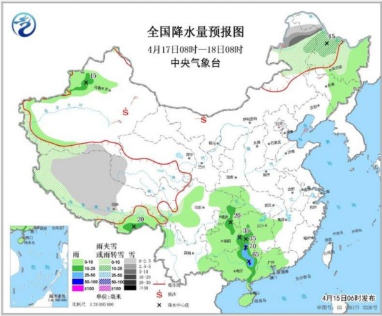 4月17日08时至18日08时,内蒙古东北部、黑龙江中西部、南疆西部、西藏大部、青海西部、川西高原等地的部分地区有小到中雪或雨夹雪,其中,内蒙古东北部局地有大雪。伊犁河谷、西藏东南部、湖南西南部、重庆中部、贵州东部、广西东部、广东西南部等地的部分地区有中到大雨,其中,广西东部局地有暴雨(50~70毫米)。内蒙古东部和西部、吉林西部、新疆东部等地的部分地区有4~6级风(见图3)。南疆盆地东部、内蒙古西部有浮尘或扬沙天气。
