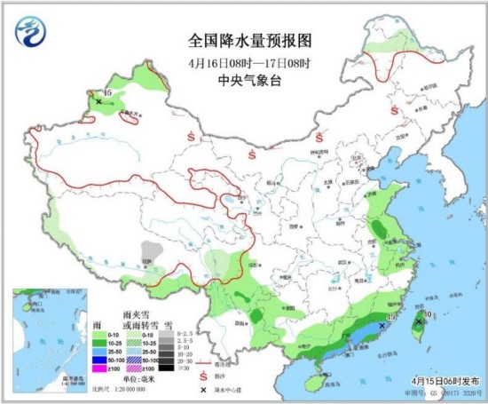图1 全国降水量预报图(4月15日08时-16日08时)