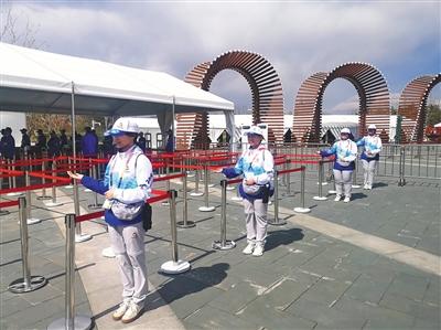 志愿者为门区游客提供接待指引服务。北京世园局供图