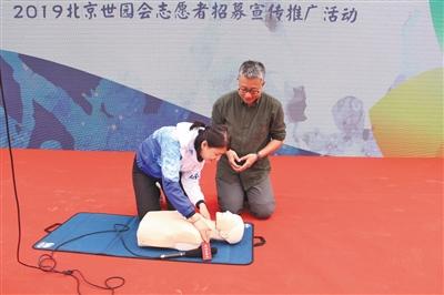 志愿者接受心肺复苏术现场急救演示培训。北京世园局供图