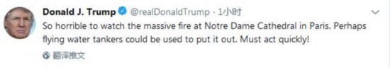 美国总统特朗普也对这座历史悠久的大教堂出现的火灾感到遗憾,他在推文中表示:“巴黎巴黎圣母院的严重火灾真是太可怕了,也许可以进行空中洒水灭火。现在必须迅速采取行动!”