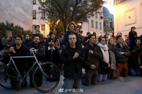 大量路人自发聚集在圣母院附近,遥望火灾地点,下跪祈祷,希望这栋800多年的古建筑能够扛过灾难。