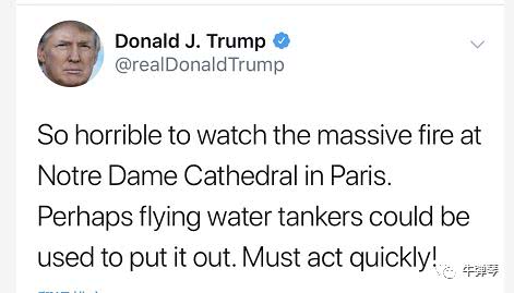 一直对法国冷嘲热讽的特朗普,还很不寻常地发推特支招说:看到巴黎圣母院大火燃烧太恐怖了,或许空中灭火可以扑灭,但必须尽快行动!