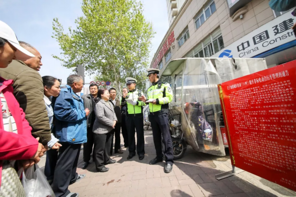 4月15日,市交警支队组织禁行区域的各交警大队,在主干道上的多个路口设置卡口,专项整治电动三(四)轮车闯禁区。