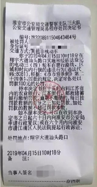 8时40分,一名老大爷驾驶电动四轮车,在翔宇大道深圳路路口被交警拦截了下来。他是给一家饭店送菜的。“饭店在此之前也给我们配了符合标准的车辆,(今天)我认为不会有多大问题,就继续开着以前的车了。”这位大爷说。依据《淮安市容管理条例》,交警对其处以100元罚款,将车辆信息录入系统后让车主签署承诺书,保证不再在禁行区域骑电动三(四)轮车。