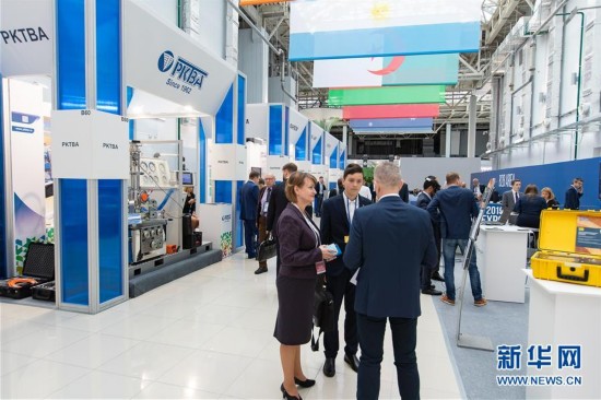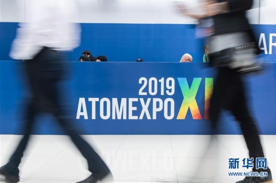 4月15日,在俄罗斯索契,参观者从中国核工业集团有限公司展区走过。 当日,第十一届俄罗斯国际核工业展览会在索契开幕。