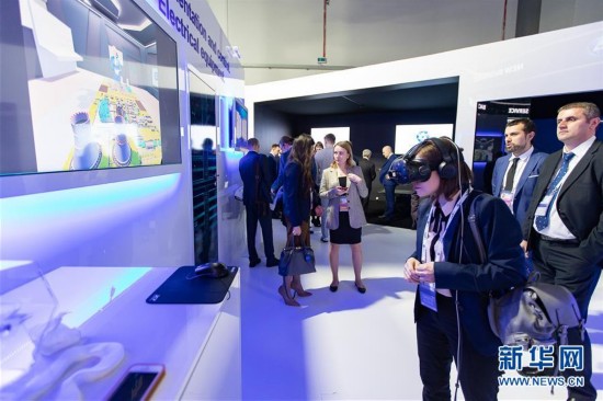 4月15日,在俄罗斯索契,一名参观者在俄罗斯国家原子能公司展区体验VR设备。 当日,第十一届俄罗斯国际核工业展览会在索契开幕。