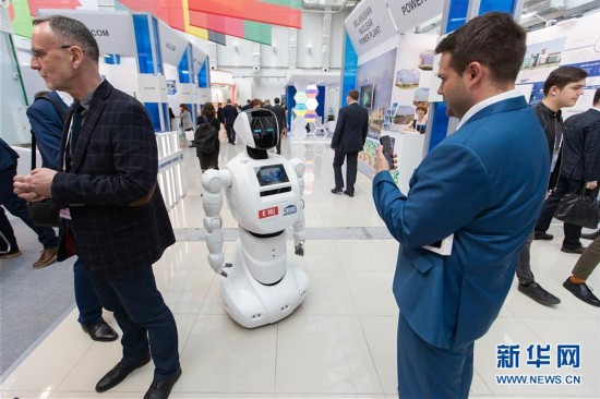4月15日,在俄罗斯索契,参观者在第十一届俄罗斯国际核工业展览会展区与智能机器人互动。 当日,第十一届俄罗斯国际核工业展览会在索契开幕。