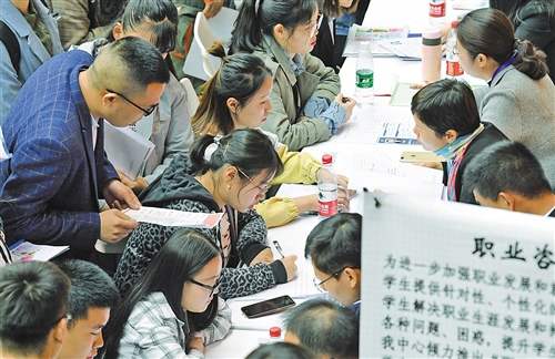 4月12日,陕西省2019届高校毕业生精准帮扶招聘会暨“百万大学生留西安”就业创业招聘会在陕西科技大学未央校区举行。专家在招聘会现场为求职者提供职业咨询。 新华社记者 张博文摄