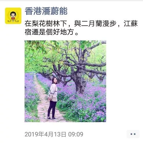 “在梨花树林下,与二月兰合照,真美!”