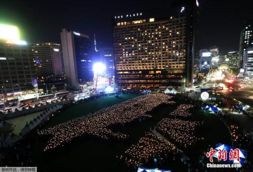 资料图:当地时间2015年4月17日,韩国首尔,4160名手举蜡烛的民众在首尔广场组成“世越号”船体的形状,纪念“世越号”客轮沉没一周年。