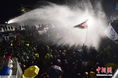 资料图:当地时间2015年4月18日,韩国首尔,“世越号”沉船遇难者家属游行前往总统府抗议遭拦阻,示威民众与警方发生冲突。
