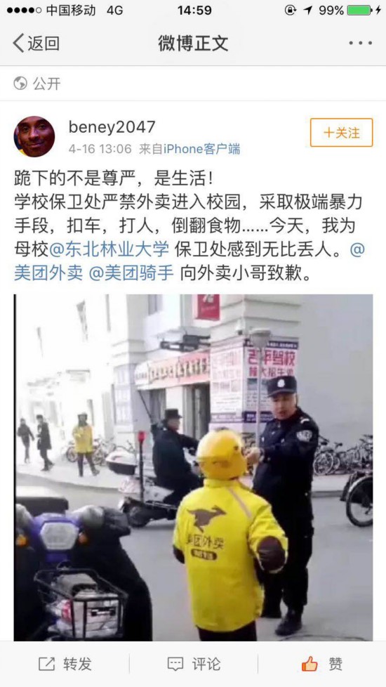 (原标题:外卖员给东北林业大学保安下跪 保安队:其个人行为)